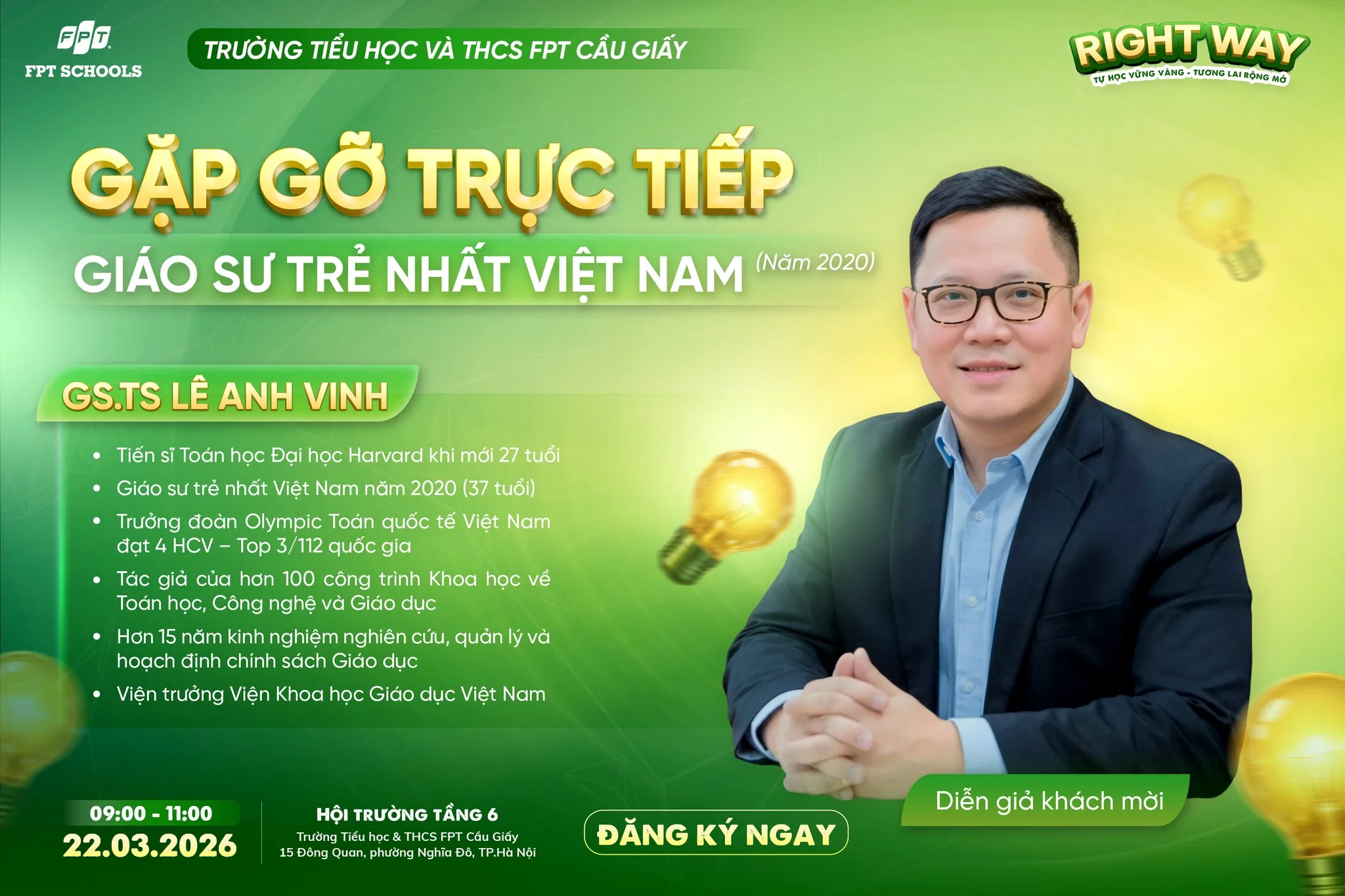 Khách mời đặc biệt của chương trình là GS.TS Lê Anh Vinh (Viện trưởng Viện Khoa học Giáo dục Việt Nam) cùng Ban Giám hiệu FPT Schools Cầu Giấy. Các diễn giả sẽ mang đến những góc nhìn khoa học, thực tiễn và đầy thấu cảm để giải mã câu hỏi lớn: