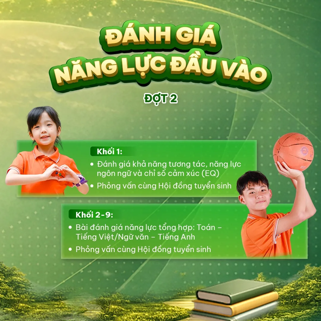 - Với các bạn khối 2 – khối 9, các con sẽ làm Bài đánh giá năng lực tổng hợp Toán – Tiếng Việt/Ngữ văn – Tiếng Anh và phỏng vấn cùng Hội đồng tuyển sinh.